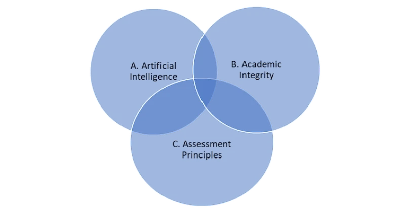 The figure below depicts three critical elements of a forward-thinking assessment system. Although each element could be elaborated, our focus is in offering educators a series of strategies that will allow them to maintain academic standards and promote authentic learning and assessment in the face of current and future AI applications.