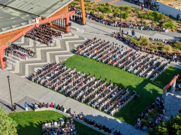 Attendees at the new student pōwhiri gather outside The Pā.