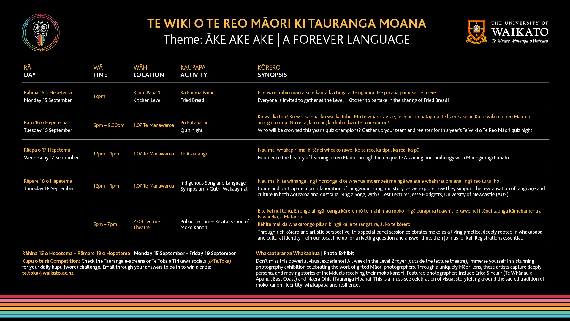 Rāhina 15 o Hepetema – Rāmere 19 o Hepetema | Monday 15 September – Friday 19 September