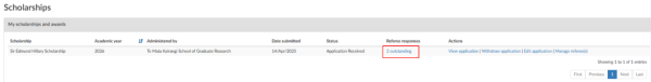Log in to your MyWaikato portal and go to the Scholarships tab. Click the hyperlink under "Referee Responses" to see which referees have submitted and which are still pending. Note that referees are responsible for uploading their own responses — late submissions cannot be accepted.