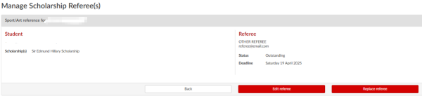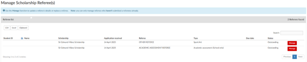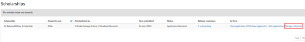 In your MyWaikato portal, go to the Scholarships tab and select Manage referee(s) next to the relevant application.