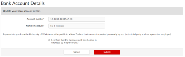 Log in to your MyWaikato portal and select Edit Details from the dropdown next to your name. Click Bank Details.